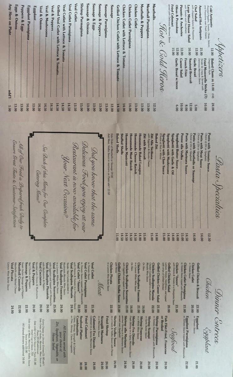 In addition to pizzas, the menu features sandwiches, referred to as Heros, including sausage and sausage with onions offerings. Pasta dishes such as spaghetti with meatballs and lasagne are also available, complementing the main pizza items. Lighter fare includes salads like Greek salad and vegetable sides such as broccoli.