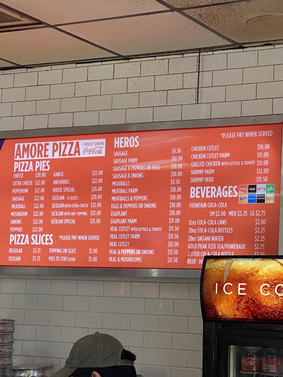 The menu at Amore Pizza offers a variety of Italian-American dishes with a focus on pizzas, sandwiches, and classic pasta options. The selection includes whole pizza pies with various toppings such as cheese, pepperoni, sausage, meatball, mushroom, onion, and garlic, alongside specialty pies like the House Special and Sicilian varieties. Pricing details are provided for each pizza type, with options for extra cheese and customized Sicilian slices.